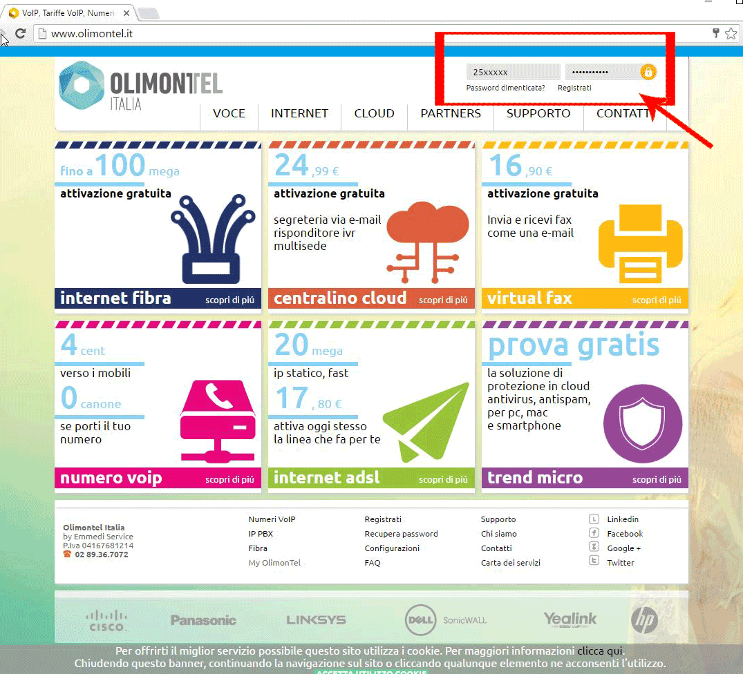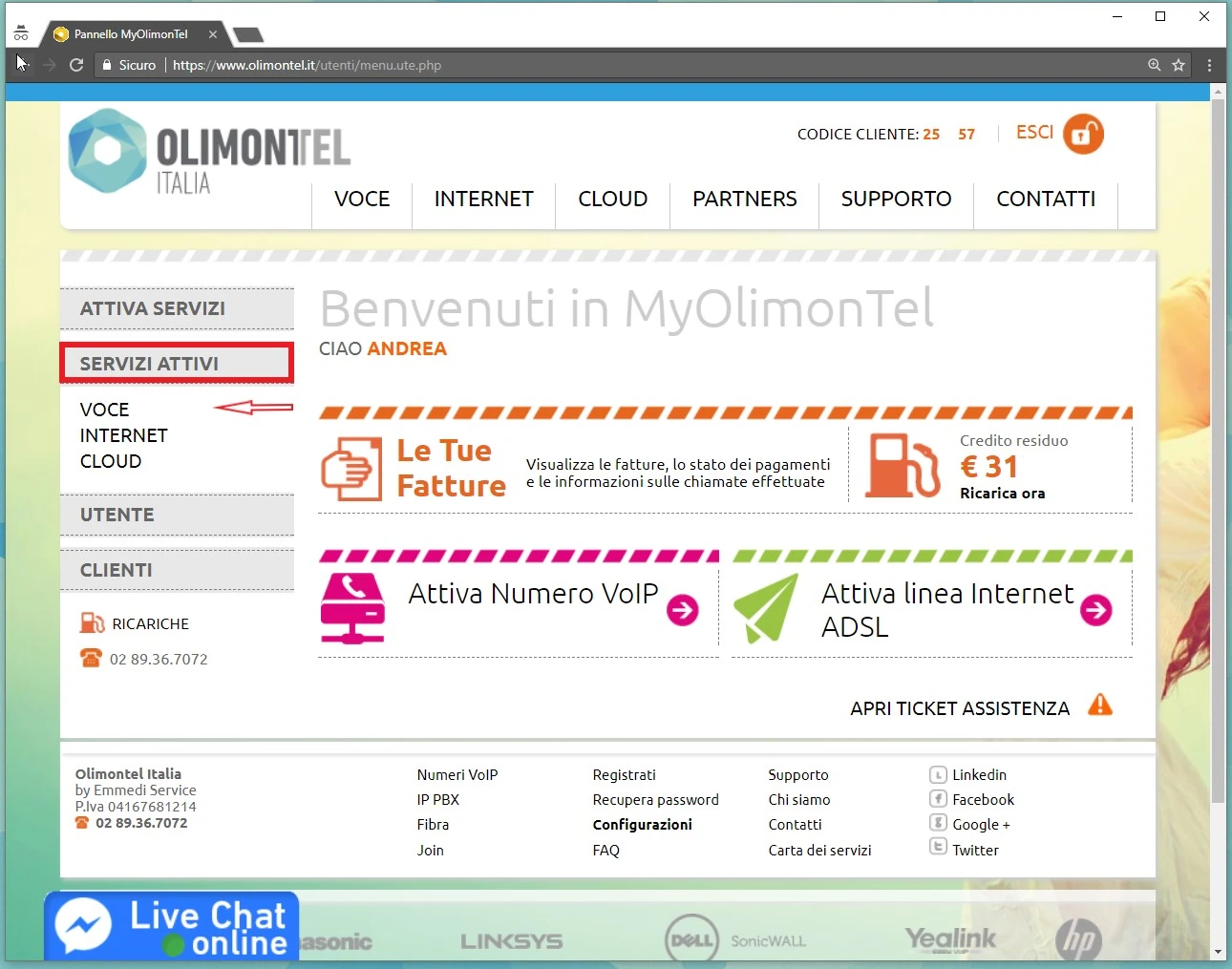 Per richieste inerenti i servizi Voce, Internet, Cloud cliccare sui Servizi Attivi e scegliere il servizio interessato (es. Voce) come indicato.