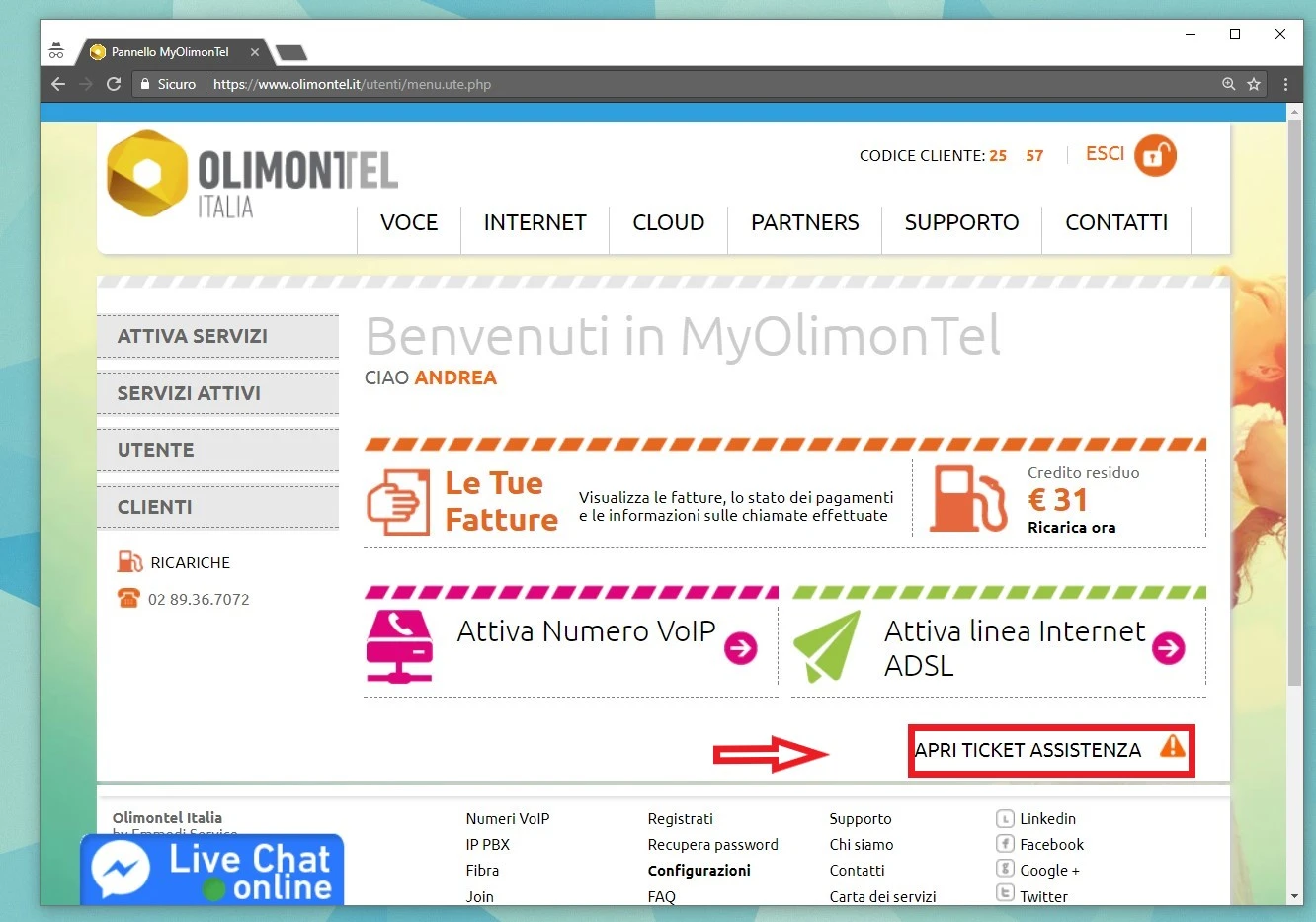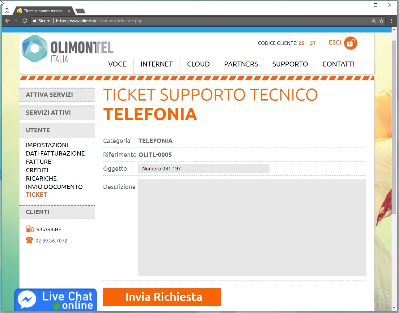 Dopo aver effettuato l’accesso all’area MyOlimonTel nella sezione superiore destra del portale www.OlimonTel.it sarà possibile aprire un ticket di assistenza.