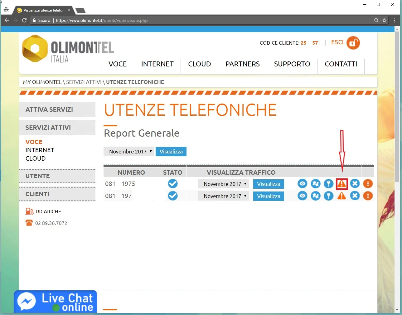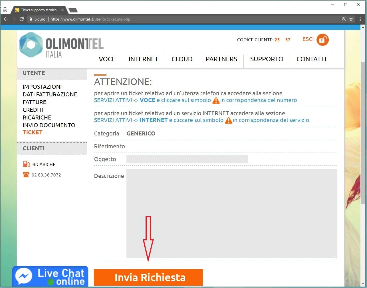 In corrispondenza dell’utenza e possibile cliccare sul tasto ” APRI TICKET” come indicato nell’immagine.