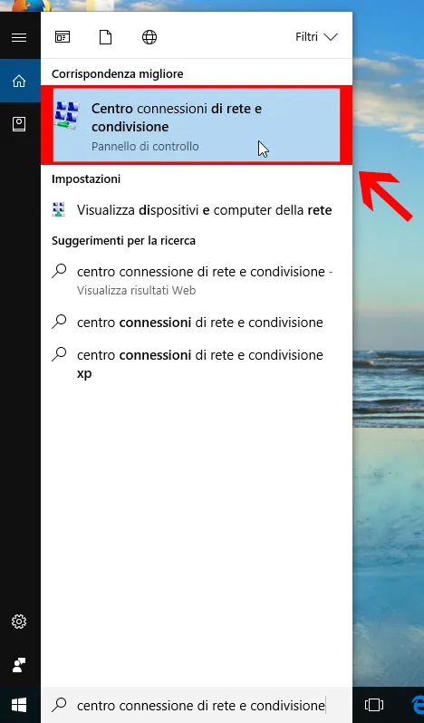Digitare nel campo di ricerca “centro connessione di rete e condivisione” e fare clic sul primo risultato visualizzato :