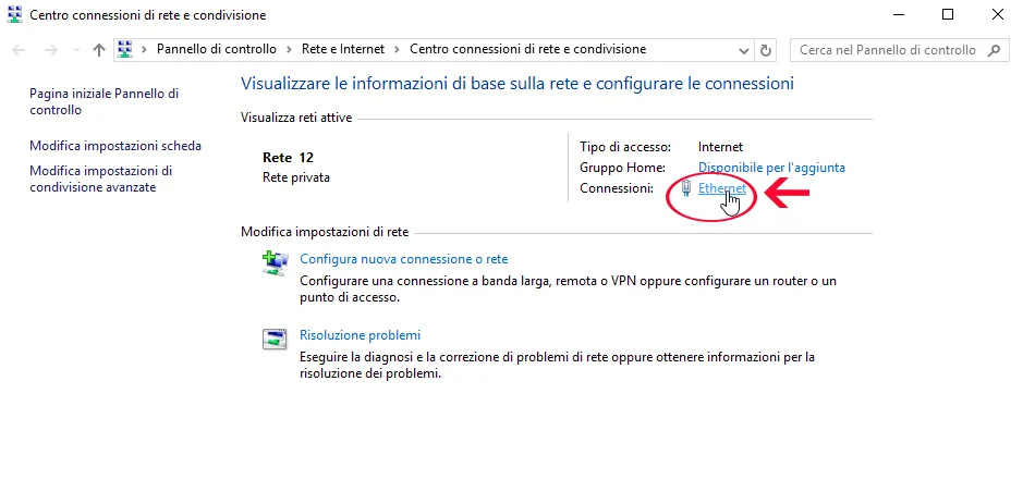 A questo punto vi sarà mostrata una schermata nel quale noi andremo a pigiare su “Ethernet”, come in figura :