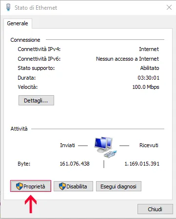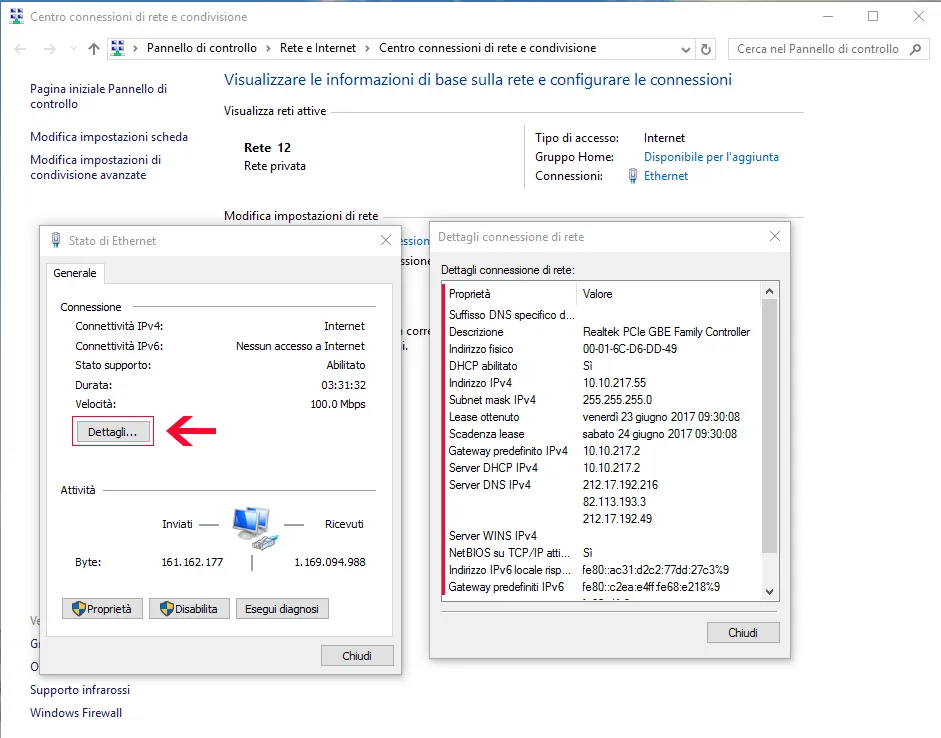 Infine, per verificare i dettagli della connessione di rete, bisogna tonare alla finestra “Stato di Ethernet” e pigiare su “Dettagli…”