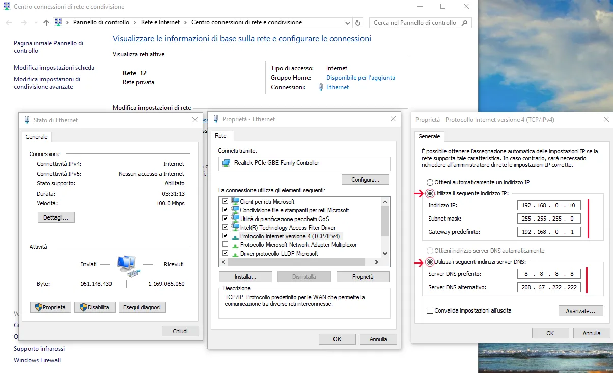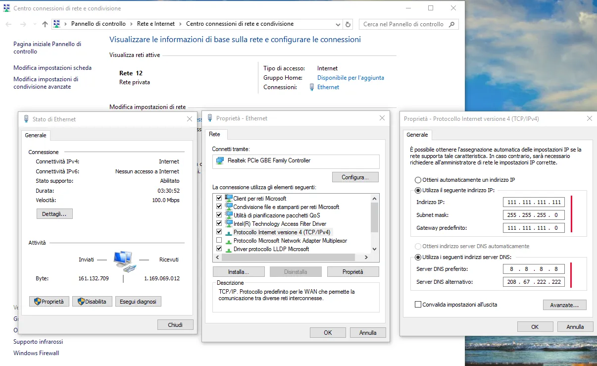 A questo punto andiamo a deselezionare la l’ottenimento automatico dell’indirizzo IP così che possiamo impostare quello di nostro interesse. Se si desidera cambiare anche il DNS del vostro computer vi invitiamo a consultare la nostra guida che trovate facilmente nella sezione :
