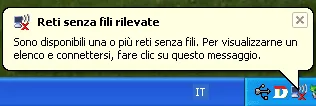 Se la connessione Wi-Fi è abilitata, Windos XP rileva automaticamente le reti senza fili disponibili. Clicca sull’icona nella barra delle applicazioni che presenta il suggerimento Connessione rete senza fili come nell’immagine.