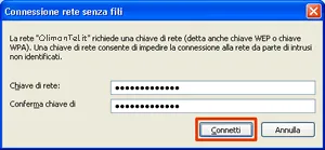 Nel campo Chiave di rete inserisci la tua password di cifratura WPA (o WEP) facendo attenzione a non immettere caratteri maiuscoli e spazi tra un carattere e l’altro. Conferma la chiave inserita e clicca sul pulsante Connetti.