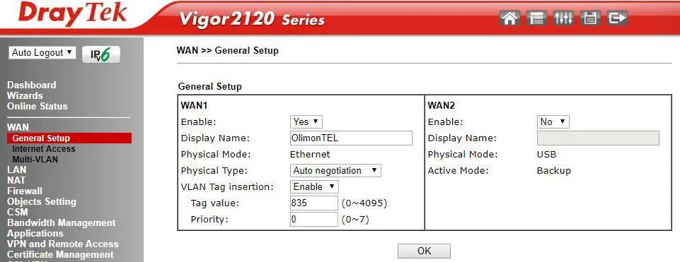 Selezionato il menù General Setup, selezionare interfaccia WAN1 per inserire i parametri di collegamento