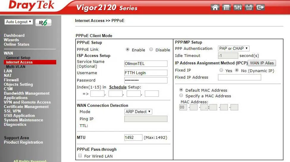 Esempio di configurazione Modem VIGOR 2120 DrayTek per il servizio Internet FIBRA FTTH