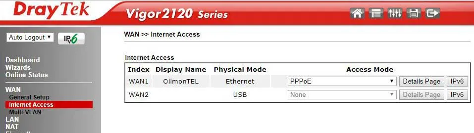 Selezionato il menù Internet Access, selezionare il tasto Details Page interfaccia WAN1 per inserire i parametri di collegamento.