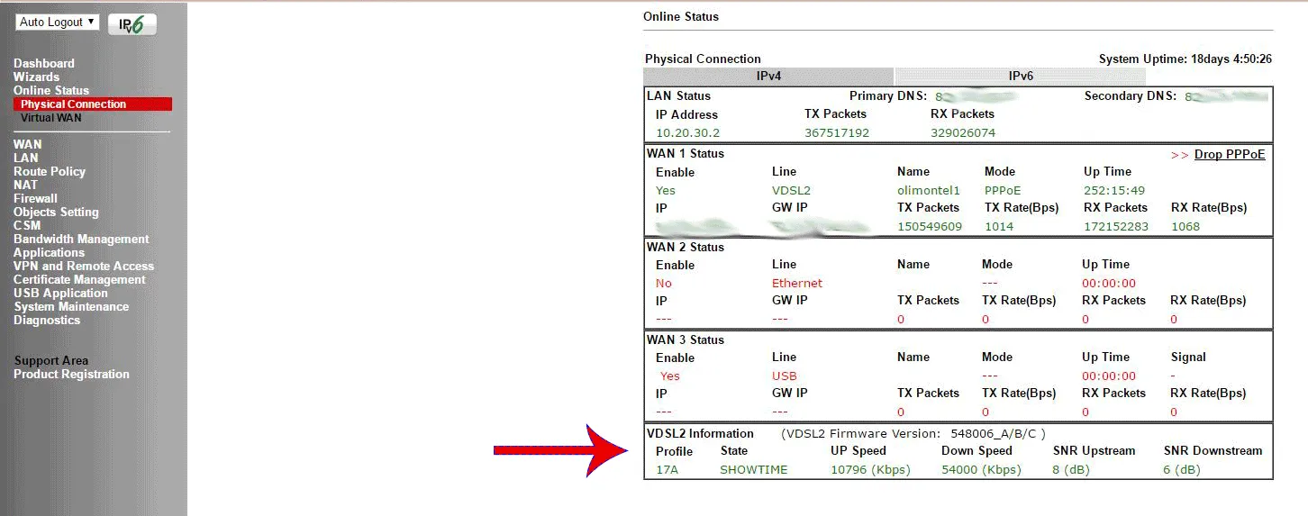 Selezionato il menù Pysical Connection è possibile verificare se il modem ha acquisito indirizzo IP.