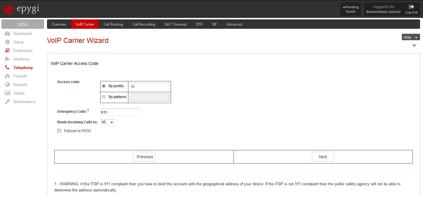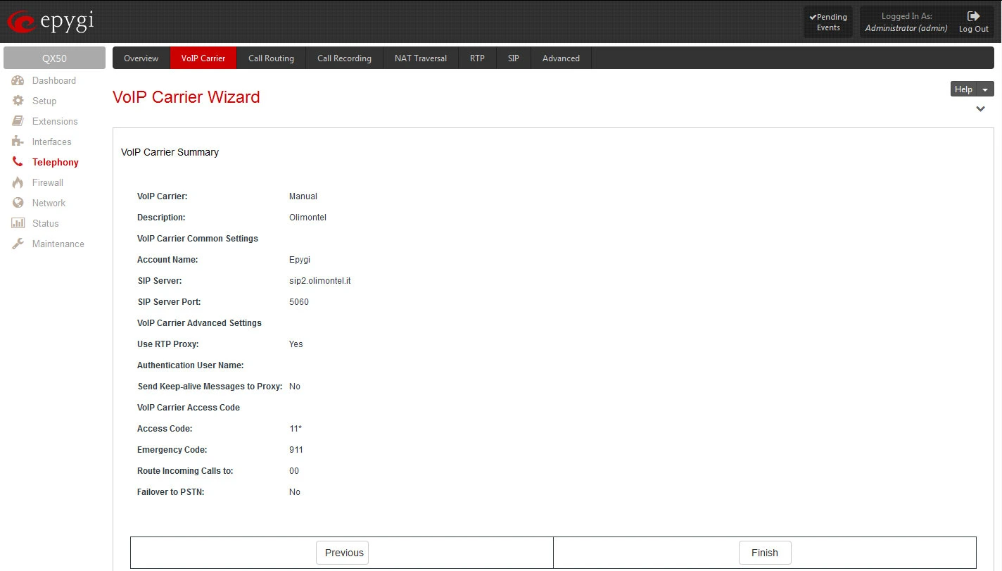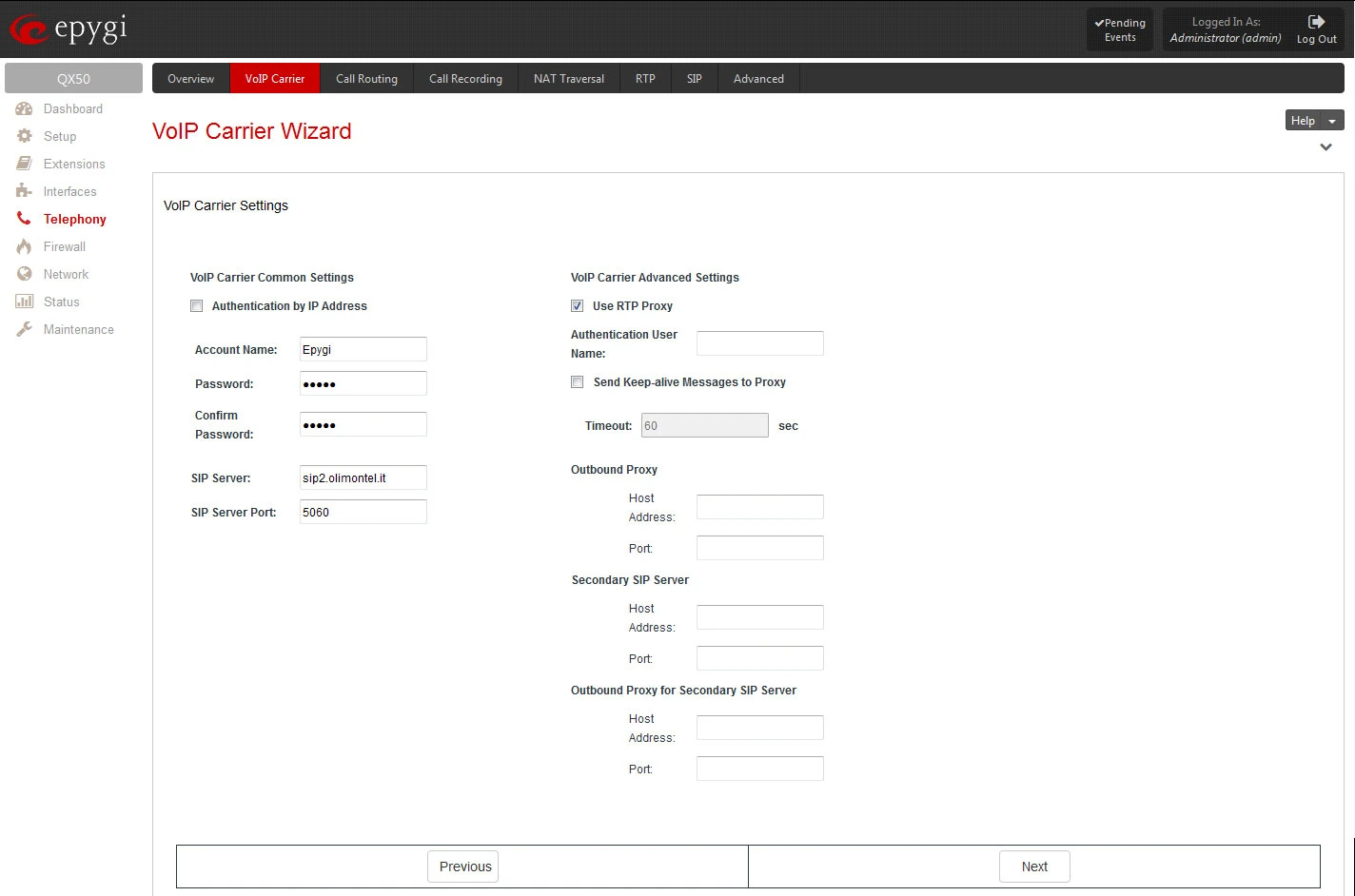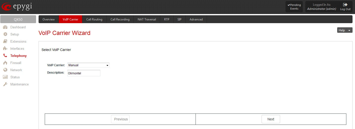 1.Accedere a Telefonia Carrier VoIP e procedere con la configurazione guidata (wizard):