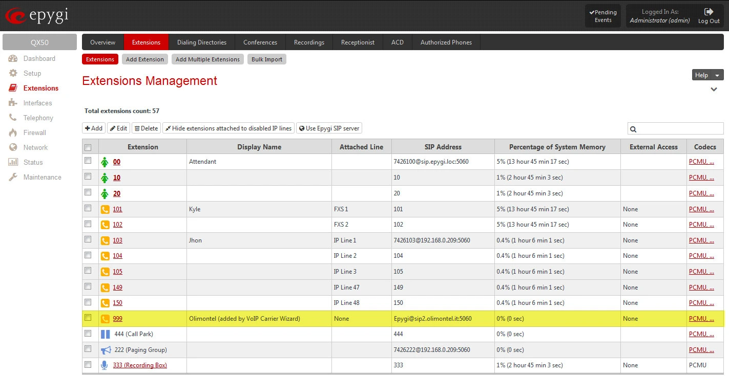 Una estensione viene automaticamente creata ed aggiunta (est.# 994 in questo esempio) in Gestione estensioni (Figura 5)