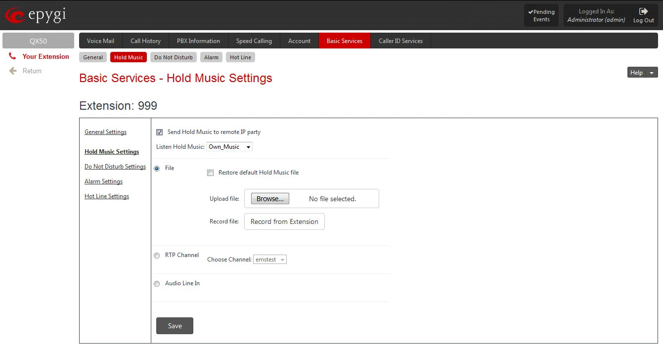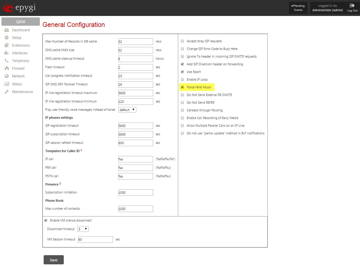 2. Su questa pagina, selezionare il checkbox Force Hold Music e cliccare su Salva.