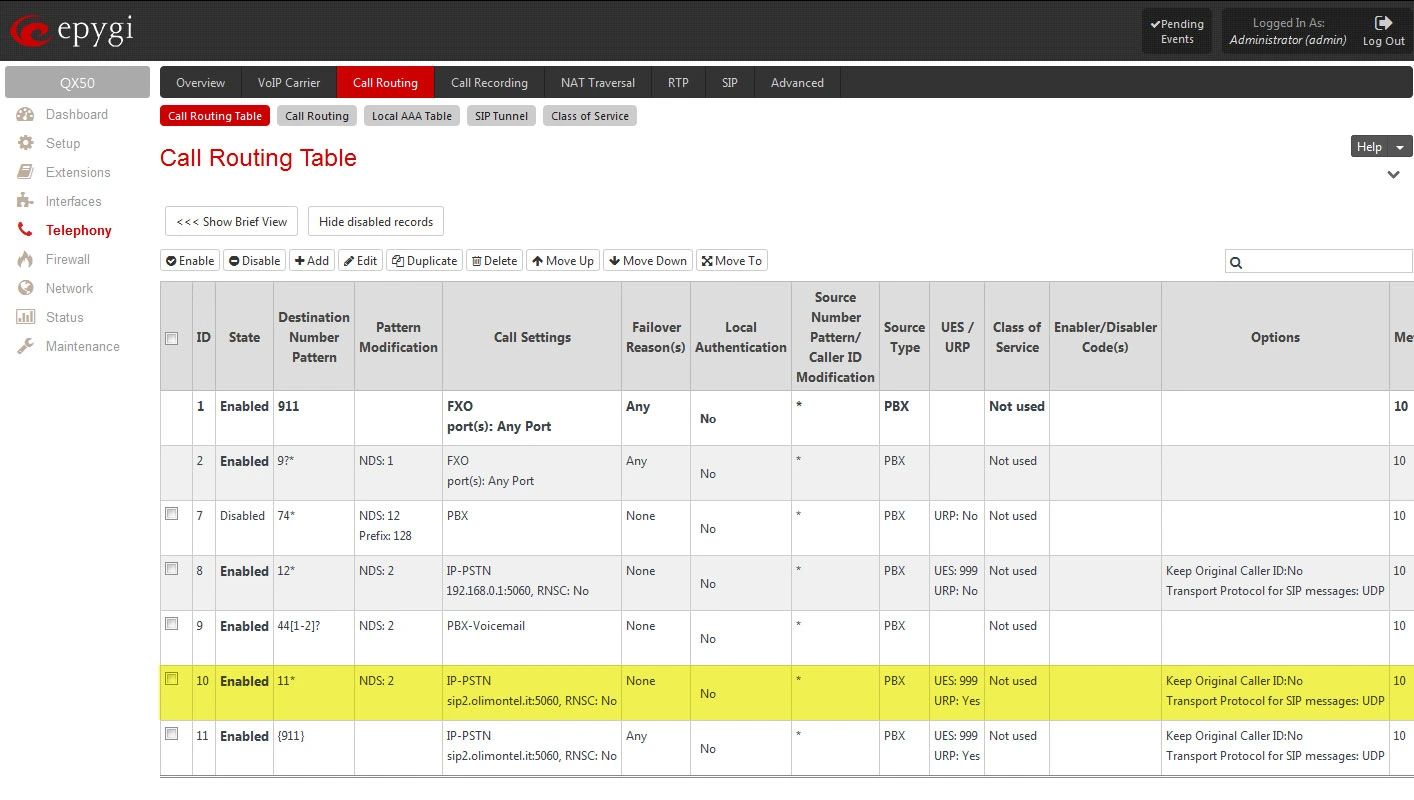 Il sistema instrada tutte le chiamate in uscita che corrispondono con il pattern 11* al trunk SIP OlimonTel.