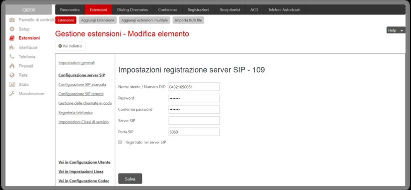 2. Un’alternativa è la configurazione dei numeri DID del range ES. 04321690050-04321690059 come Nome utente / Numero DID sotto
