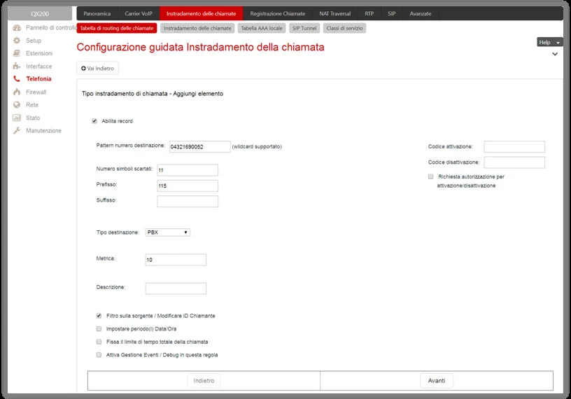 Aggiungi. Comparirà quindi la Configurazione guidata Instradamento della chiamata dove si dovranno inserire i seguenti parametri