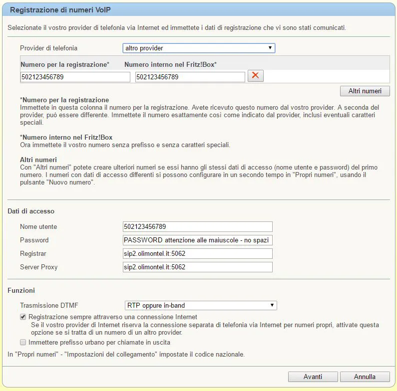 “Numero per la registrazione” e “Numero interno nel Fritz!Box” inserire la login VOIP fornita con la mail di attivazione.