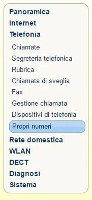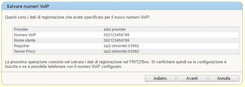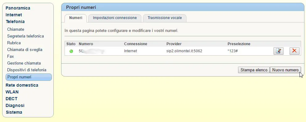 Il vostro Fritz!Box dopo aver confermato e completato la configurazione vi riporterà nella schermata “Propri Numeri” dove troverete il vostro account VoIP OlimonTel.