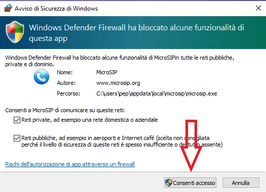 Vi ricordiamo di AUTORIZZARE l’accesso ad Internet dell’applicazione come nell’immagine sotto riportata.