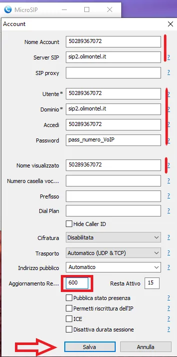 ES. Numero voip 0289367072 va inserita la Login che corrisponde al numero con il 5 anteposto,seguito dal server sempre indicato nella mail di attivazione.