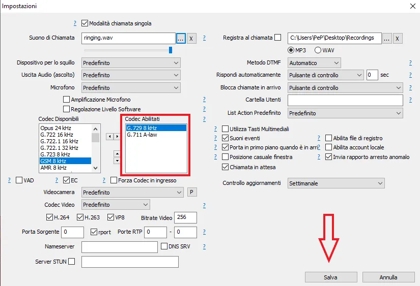 Abilitare i codec indicati seguendo l’ordinamento ed infine salvare.