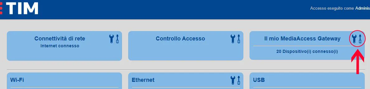 Dopo aver effettuato l’accesso al pannello di controllo del modem TIM, clicchiamo il pulsante delle impostazioni relativo alla casella “Il mio MediaAccess Gateway” come riportato in figura :
