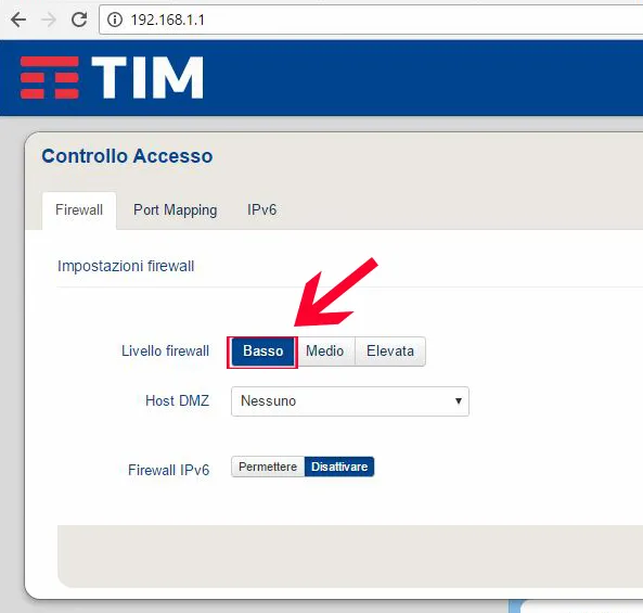 Infine nella sezione Controllo accesso —> Firewall possiamo consigliare di impostare a “Basso” il livello del firewall :