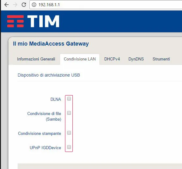 A questo punto andiamo nella sezione “Condivisione LAN” e consigliamo di eliminare tutte le spunte relative al dispositivo di archiviazione USB.