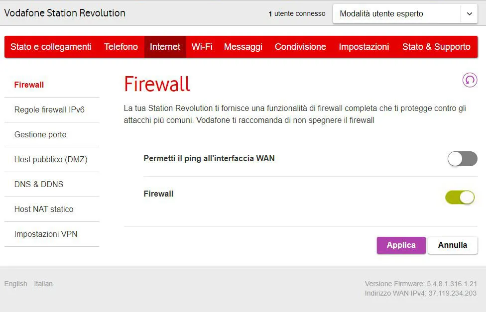 ATTENZIONE disabilitare il Firewall può esporre a vulnerabilità la propria rete !