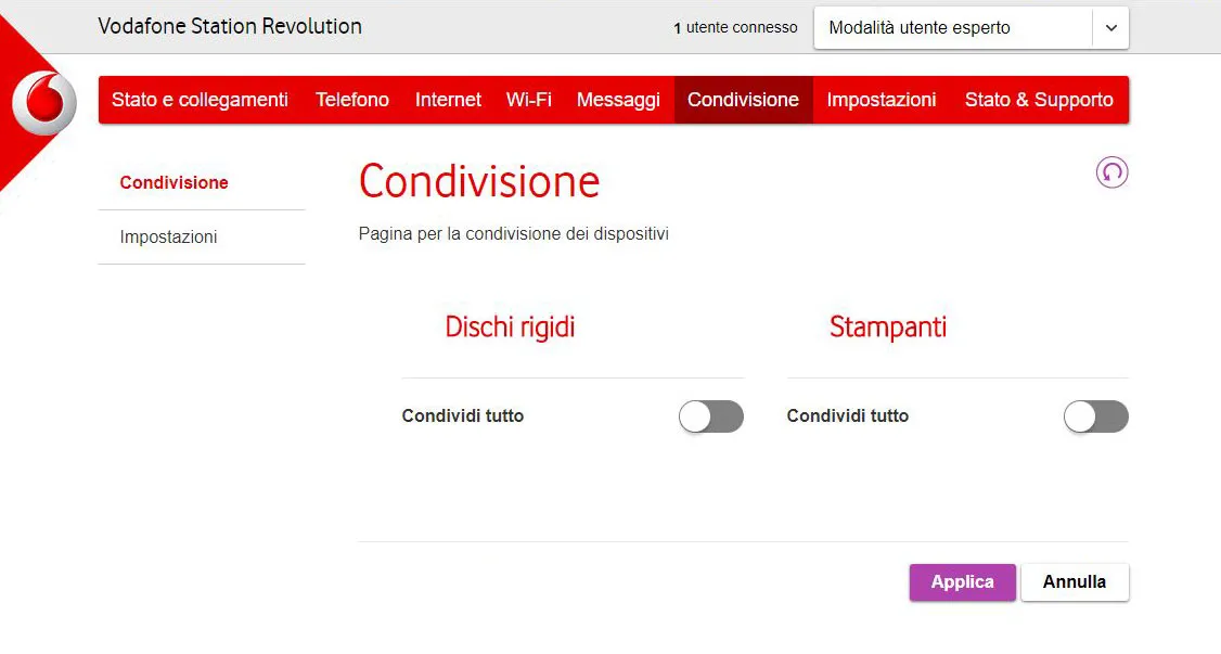Dopo aver effettuato accesso alla Vodafone Station selezionare in alto a destra la modalità ESPERTO.