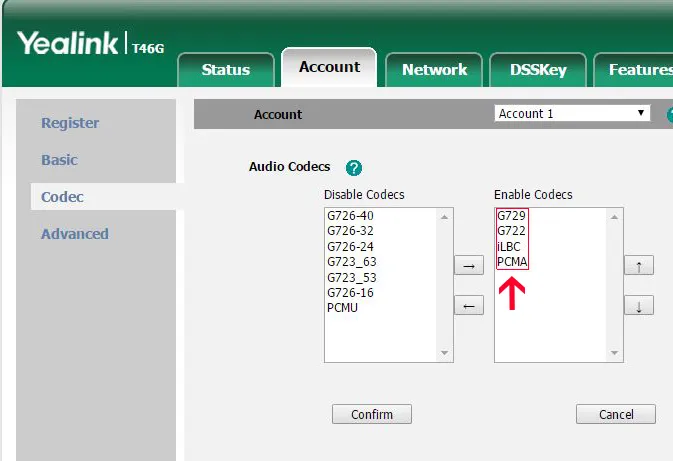 Numero VoIP di OlimonTel utilizza i codec G729a e G711a, consigliamo di utilizzare il g729a come primo codec, e g711a come ultimo, abilitare alti codec è possibile come in figura :