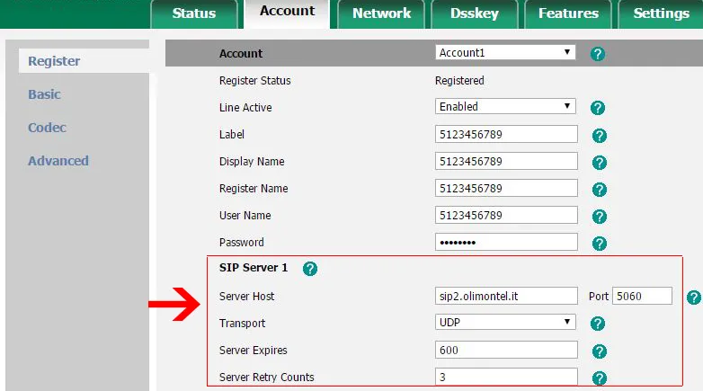 Nel campo SIP SERVER va inserito il dominio associato al servizio Numero Voip.