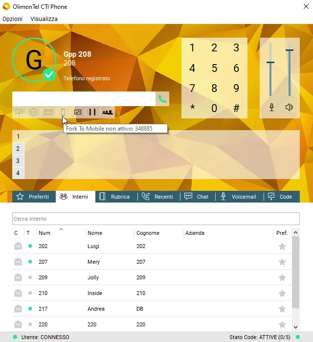 Da Computer: se il servizio Fork2Mobile è attivo per l’interno, sotto la casella di composizione del numero appare l’icona ( smartphone ) fork2mobile. Cliccando sull’icona il servizio viene attivato e l’icona diventa attiva. La disattivazione viene effettuata cliccando nuovamente sull’icona. Posizionando il puntatore del mouse sull’icona è anche possibile visualizzare il numero mobile utilizzato dal servizio.