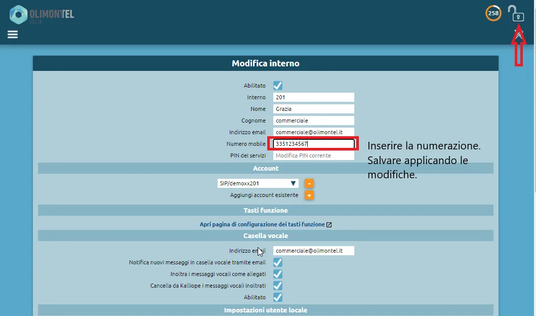 Il servizio Fork2Mobile è sempre attivo a livello globale. Per abilitare il servizio per lo specifico interno è però necessario associare il proprio numero mobile nel pannello dell’interno effettuando l’accesso con il ” postmaster ” e le relative credenziali.