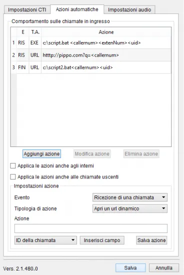 La tabella posta nella parte superiore del pannello contiene la lista delle azioni configurate, indicando per ciascuna di esse la tipologia di evento (“IN” = chiamata in arrivo, “RIS” = risposta ad una chiamata, “FIN” = chiusura di una chiamata), la tipologia di azione (“EXE” = esecuzione di un processo esterno, “URL” = apertura di un url dinamico) e il dettaglio dell’azione.