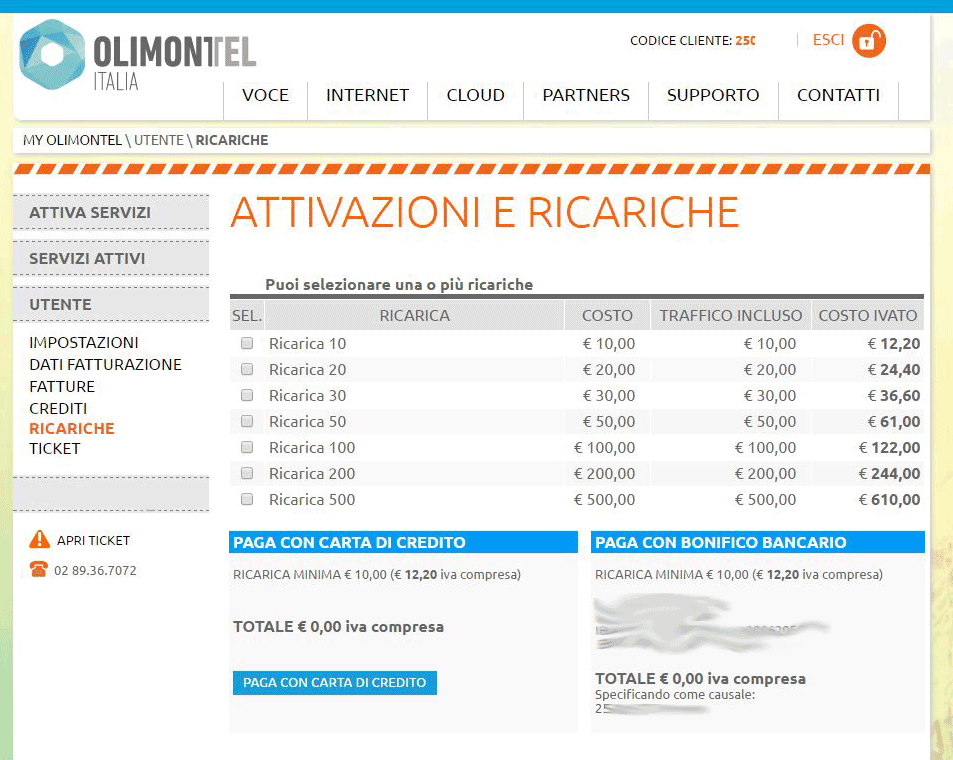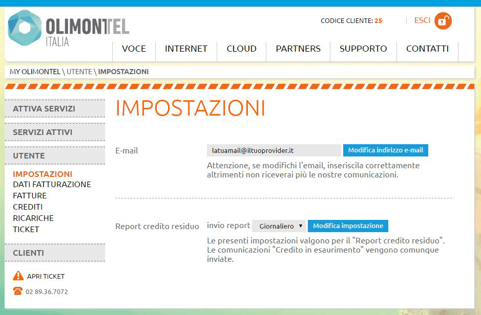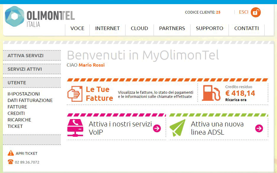 Dopo aver effettuato la registrazione verrà assegnato un codice cliente che permette l’accesso all’area privata MyOlimonTel.